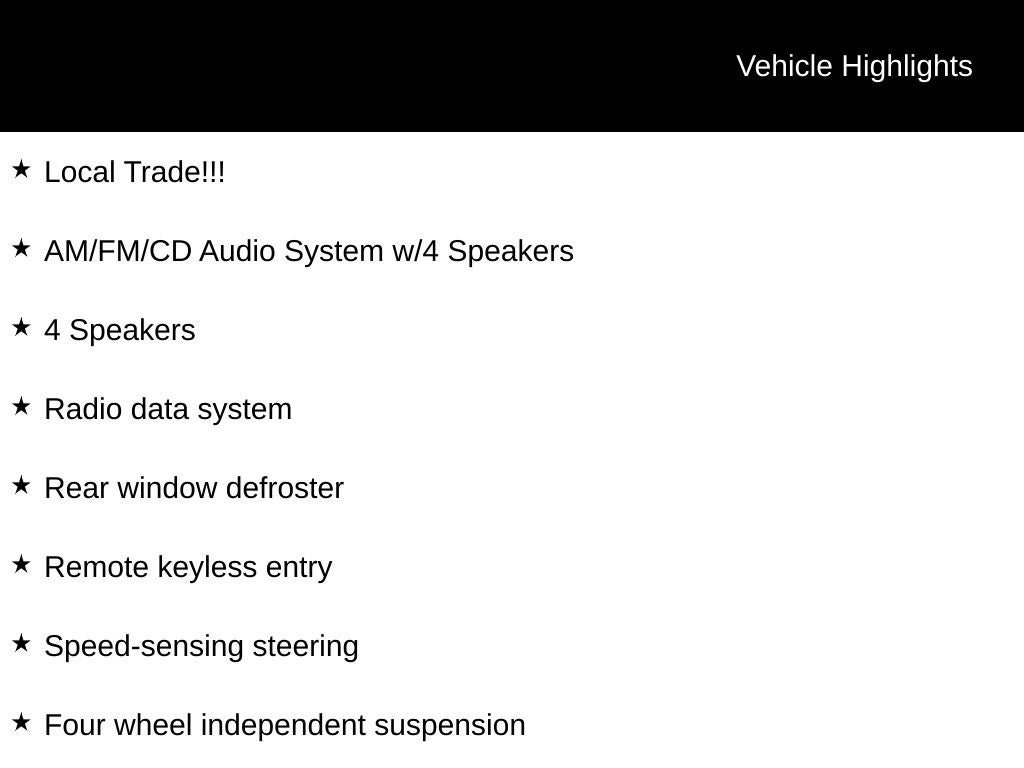 - Radio: AM/FM/CD Audio System w/4 Speakers -inc: iPod connect