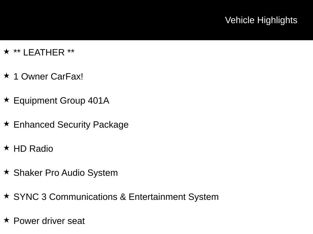 - SYNC 3 Communications & Entertainment System -inc: enhanced voice recognition, 8" LCD capacitive touch screen in center stack w/swiping capability, pinch-to-zoom capability included w/available voice-activated touch screen navigation system, AppLink, 911 Assist and 2 smart charging USB ports, NOTE: SYNC AppLink lets you control some of your favorite compatible mobile apps w/your voice, It is compatible w/select smartphone platforms, Commands may vary by phone and AppLink software