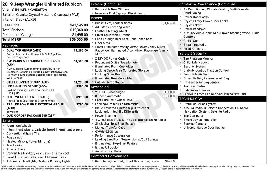 Granite Crystal Metallic Clearcoat 2019 Jeep Wrangler Unlimited Rubicon 4WD 8-Speed Automatic 2.0L I4 DOHC Low Miles!!!, Apple CarPlay/Android Auto, Wrangler Unlimited Rubicon, 4D Sport Utility, 8-Speed Automatic, 4WD, Granite Crystal Metallic Clearcoat, Black w/Cloth Low-Back Bucket Seats or Leather Trimmed Bucket Seats or Leather Trimmed Seats w/Sahara Logo or McKinley Leather Seats w/Jeep Logo, 1-Year SiriusXM Guardian Trial, 240 Amp Alternator, 4G LTE Wi-Fi Hot Spot, 5-Year SiriusXM Traffic Service, 5-Year SiriusXM Travel Link Service, 7 & 4 Pin Wiring Harness, 700 Amp Maintenance Free Battery, 8.4 Radio & Premium Audio Group, 8.4 Touchscreen Display, Auto-Dimming Rear-View Mirror, Automatic temperature control, Auxiliary Switches, Brake assist, Class II Receiver Hitch, Cold Weather Group, Daytime Running Lamps LED Accents, Electronic Stability Control, Emergency/Assistance Call, For Details, Visit DriveUconnect.ca, Front dual zone A/C, Front fog lights, Front LED Fog Lamps, Fully automatic headlights, GPS Navigation, HD Radio, Heated Front Seats, Heated Steering Wheel, LED Lighting Group, LED Reflector Headlamps, LED Taillamps, ParkView Rear Back-Up Camera, Performance Suspension, Quick Order Package 28R, Radio: Uconnect 4C Nav w/8.4 Display, Remote keyless entry, Security system, SiriusXM Traffic Plus, SiriusXM Travel Link, Speed control, Steel Bumper Group, Steel Front Bumper, Steel Rear Bumper, Steering wheel mounted audio controls, Traction control, Trailer Tow & HD Electrical Group, Variably intermittent wipers, Wheels: 17 x 7.5 Polished w/Black Pockets (DISC).