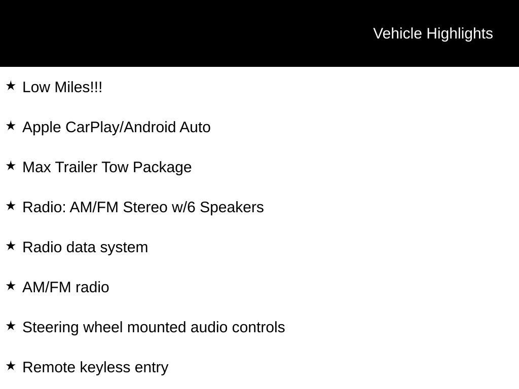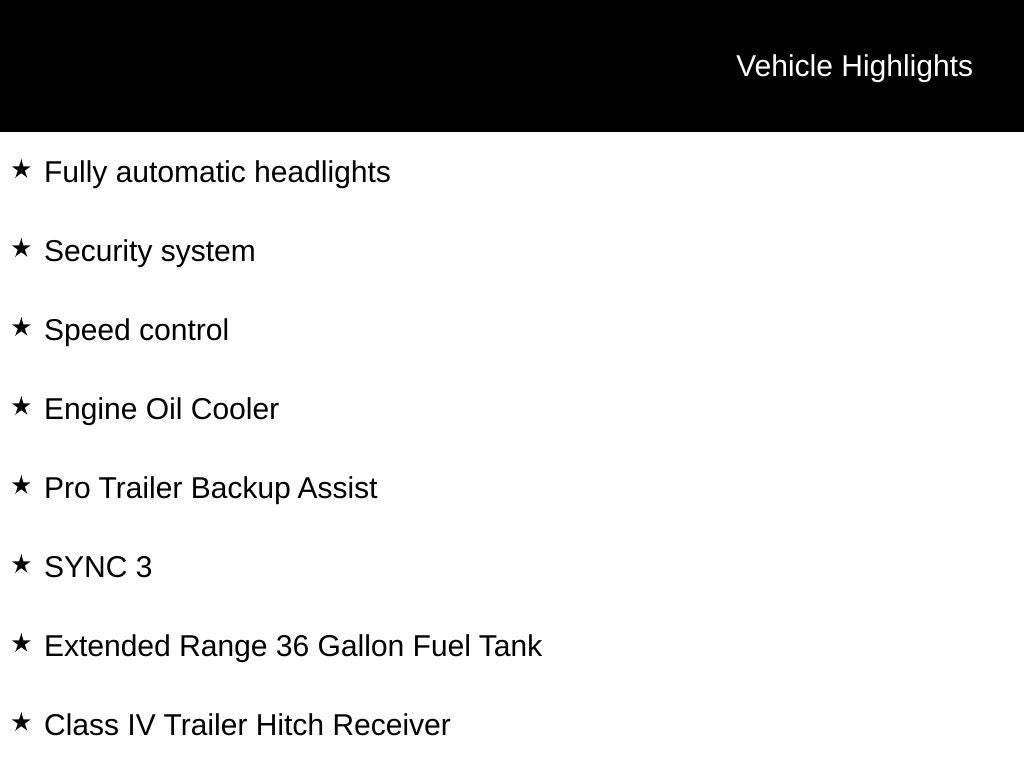 - AM/FM radio, Radio data system, Radio: AM/FM Stereo w/6 Speakers, Remote keyless entry, Steering wheel mounted audio controls, Speed control, Brake assist, Electronic Stability Control, Extended Range 36 Gallon Fuel Tank, Speed-sensing steering, Traction control, Upgraded Front Stabilizer Bar, Auto High-beam Headlights, Front fog lights, Fully automatic headlights, Engine Oil Cooler, Pro Trailer Backup Assist, SYNC 3, Exterior Parking Camera Rear, Security system, Class IV Trailer Hitch Receiver, Integrated Trailer Brake Controller, Wheels: 17 Silver Painted Aluminum, Variably intermittent wipers