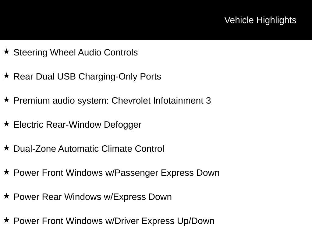 - Convenience Package includes (CJ2) dual-zone automatic climate control, (A2X) 10-way power driver seat including power lumbar, (KA1) heated driver and passenger seats, (NP5) leather-wrapped steering wheel, (KI3) heated steering wheel and (N37) manual tilt/telescoping steering column (Vehicles built prior to 11-15-2021 not equipped with (RG4) Fleet LT Base Content Package Delete include heated driver and front outboard passenger seats. Certain vehicles built on or after 11-15-2021 will be forced to include (00V) Not Equipped with Heated or Ventilated Front Seats, which removes heated front seats. Vehicles built prior to 12-6-2021 not equipped with (RG4) Fleet LT Base Content Package Delete include heated steering wheel. Vehicles built on or after 12-6-2021 will be forced to include (00G) Not Equipped with Heated Steering Wheel, which removes the heated steering wheel. See dealer for details or the window label for the features on a specific vehicle. Includes (USS) 2 charge-only USB ports for second row, (C49) rear-window defogger, (KPA) auxiliary power outlet, (AVJ) Keyless Open and Start, (BTV) Remote Start, (UTJ) content theft alarm, (AZ3) front 40/20/40 split-bench with under-seat storage and (UF2) bed LED cargo area lighting. Deleted when (RG4) Fleet LT Base Content Package Delete is ordered.)