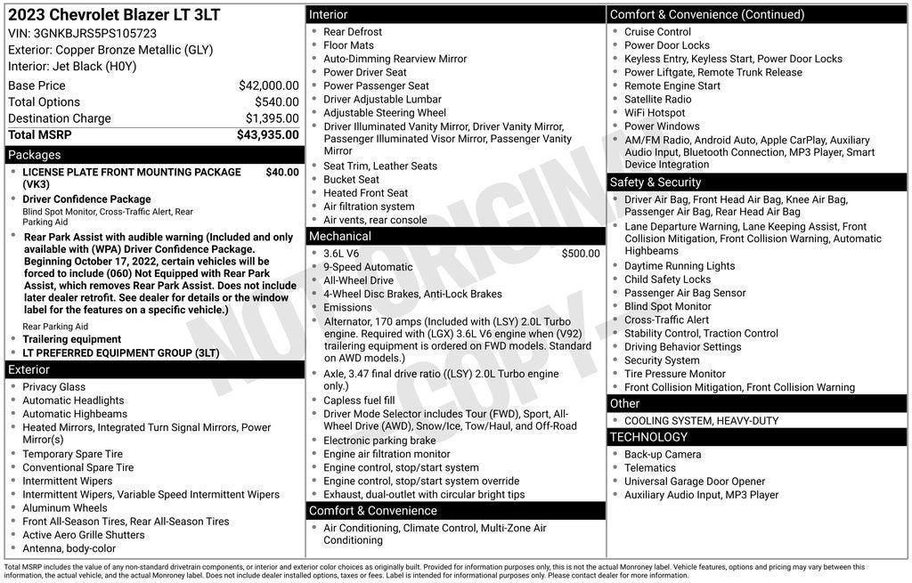 Elevate your driving experience with this stunning 2023 Chevrolet Blazer LT. This versatile SUV combines bold style, exceptional performance, and an array of advanced features to elevate your daily commute and weekend adventures.Boasting a sleek and eye-catching Orange exterior, this Blazer LT is powered by a potent 3.6L V6 SIDI engine paired with a 9-Speed Automatic transmission and All-Wheel Drive, delivering an impressive balance of power and efficiency with 19 city/26 highway MPG.Key features include:• Driver Confidence Package• Preferred Equipment Group 3LT• Chevrolet Infotainment 3 Plus System with 6-Speaker Audio• Dual-Zone Automatic Climate Control• Heated Front Seats and Power-Adjustable Driver's Seat• Rear Park Assist with Audible Warning• Lane Change Alert with Side Blind Zone Alert• Rear Cross Traffic AlertThe Blazer LT's spacious and well-appointed interior offers exceptional comfort and convenience, with ample cargo space and a host of connectivity and safety technologies to keep you and your passengers connected and secure. Whether you're navigating the city streets or exploring the open road, this Blazer LT is the perfect companion.Experience the perfect blend of style, performance, and advanced features in this 2023 Chevrolet Blazer LT. Visit our showroom today to take this remarkable SUV for a test drive and discover why it's the perfect choice for your next vehicle.