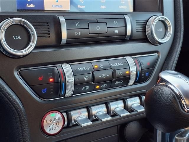 This Mustang is well equipped with Equipment Group 200A, Alloy wheels, Climate Controlled Heated/Cooled Front Seats, Heated front seats, Security system, Steering wheel mounted audio controls, Traction control, Ventilated front seats, 4-Wheel Disc Brakes, 4G LTE Wi-Fi Hotspot Removal, 9 Speakers, ABS brakes, ActiveX Bucket Seats, Air Conditioning, AM/FM radio: SiriusXM, AM/FM Stereo, Auto High-beam Headlights, Auto-dimming Rear-View mirror, Automatic temperature control, Brake assist, Bumpers: body-color, Compass, Convertible roof lining, Delay-off headlights, Driver door bin, Driver vanity mirror, Dual front impact airbags, Dual front side impact airbags, Electronic Stability Control, Emergency communication system: 911 Assist, Exterior Parking Camera Rear, Four wheel independent suspension, Front anti-roll bar, Front Bucket Seats, Front Center Armrest, Front dual zone A/C, Front reading lights, Fully automatic headlights, Glass rear window, Heated door mirrors, Illuminated entry, Knee airbag, Leather Shift Knob, Low tire pressure warning, Occupant sensing airbag, Outside temperature display, Overhead console, Panic alarm, Passenger door bin, Passenger vanity mirror, Power convertible roof, Power door mirrors, Power driver seat, Power passenger seat, Power steering, Power windows, Radio data system, Rain sensing wipers, Rear anti-roll bar, Rear Parking Sensors, Rear window defroster, Remote keyless entry, SiriusXM Radio, Speed control, Speed-sensing steering, Speed-Sensitive Wipers, Spoiler, SYNC 3 Communications & Entertainment System, Tachometer, Telescoping steering wheel, Tilt steering wheel, Trip computer, Variably intermittent wipers, Voltmeter, and Wheels: 18 x 8 Machined-Face Aluminum.
