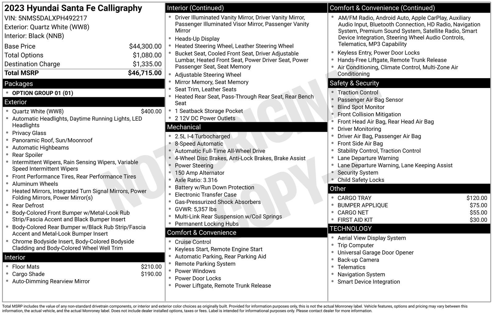 APPLE CARPLAY, ANDROID AUTO, Santa Fe Calligraphy, 4D Sport Utility, 2.5L I4, Shiftronic, AWD, Quartz White, Black w/Leather Seat Trim, Apple CarPlay & Android Auto, Exterior Parking Camera Rear, Front dual zone A/C, Heated & Ventilated Front Bucket Seats, Heated rear seats, Navigation System, Option Group 01, Power driver seat, Power Liftgate, Power moonroof, Power passenger seat, Radio: AM/FM Harman Kardon Display Audio, Remote keyless entry, Wheels: 20 x 8.0J Alloy, 12 Speakers, 4-Wheel Disc Brakes, ABS brakes, Air Conditioning, Alloy wheels, AM/FM radio: SiriusXM, Auto High-beam Headlights, Auto-dimming Rear-View mirror, Automatic temperature control, Axle Ratio: 3.316, Brake assist, Bumper Applique, Bumpers: body-color, Cargo Cover/Screen, Cargo Net, Cargo Tray, Carpeted Floor Mats, Delay-off headlights, Driver door bin, Driver vanity mirror, Dual front impact airbags, Dual front side impact airbags, Electronic Stability Control, Emergency communication system, First Aid Kit, Four wheel independent suspension, Front anti-roll bar, Front Bucket Seats, Front Center Armrest, Front reading lights, Fully automatic headlights, Garage door transmitter: HomeLink, harman/kardon® Speakers, Heads-Up Display, Heated door mirrors, Heated front seats, Heated steering wheel, Illuminated entry, Leather steering wheel, Low tire pressure warning, Memory seat, Occupant sensing airbag, Outside temperature display, Overhead airbag, Overhead console, Panic alarm, Passenger door bin, Passenger vanity mirror, Power door mirrors, Power steering, Power windows, Quilted Premium Nappa Leather Seat Trim, Rain sensing wipers, Rear anti-roll bar, Rear seat center armrest, Rear window defroster, Rear window wiper, Security system, Speed control, Speed-sensing steering, Split folding rear seat, Spoiler, Steering wheel mounted audio controls, Tachometer, Telescoping steering wheel, Tilt steering wheel, Traction control, Trip computer, Turn signal indicator mirrors, Variably intermittent wipers, Ventilated front seats, Santa Fe Calligraphy, 4D Sport Utility, 2.5L I4, Shiftronic, AWD, Quartz White, Black w/Leather Seat Trim, Apple CarPlay & Android Auto, Exterior Parking Camera Rear, Front dual zone A/C, Heated & Ventilated Front Bucket Seats, Heated rear seats, Navigation System, Option Group 01, Power driver seat, Power Liftgate, Power moonroof, Power passenger seat, Radio: AM/FM Harman Kardon Display Audio, Remote keyless entry, Wheels: 20 x 8.0J Alloy. 21/28 City/Highway MPG