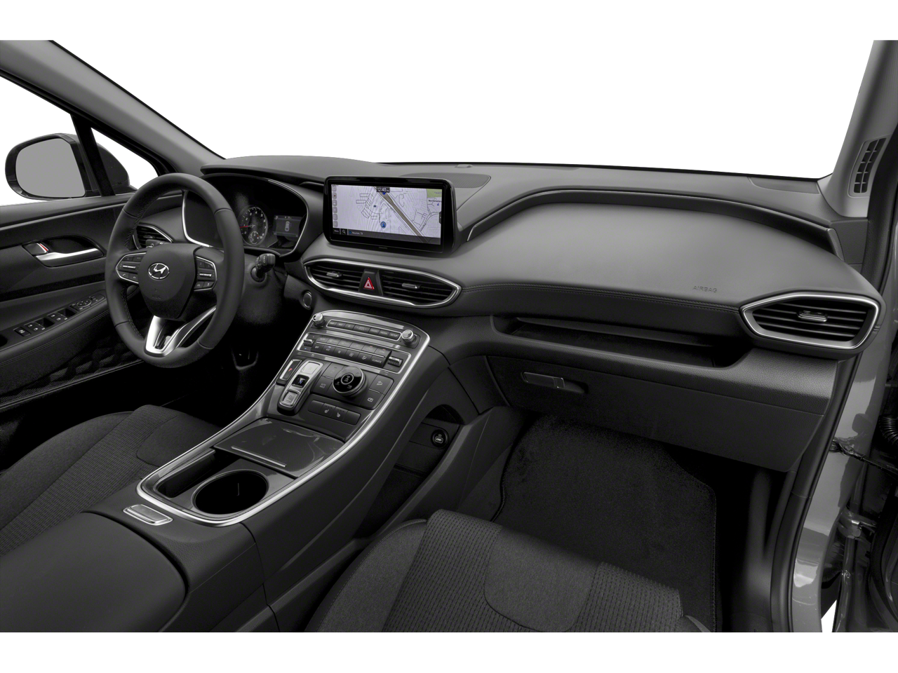 This Santa Fe is well equipped with Option Group 01, Alloy wheels, Apple CarPlay & Android Auto, Navigation System, Power driver seat, Power Liftgate, Remote keyless entry, Security system, Steering wheel mounted audio controls, Traction control, 18 x 7.5J Alloy Wheels, 4-Wheel Disc Brakes, 6 Speakers, ABS brakes, Air Conditioning, AM/FM radio: SiriusXM, Auto High-beam Headlights, Automatic temperature control, Axle Ratio: 4.081, Brake assist, Bumpers: body-color, Delay-off headlights, Driver door bin, Driver vanity mirror, Dual front impact airbags, Dual front side impact airbags, Electronic Stability Control, Emergency communication system, Exterior Parking Camera Rear, Four wheel independent suspension, Front anti-roll bar, Front Bucket Seats, Front Center Armrest, Front dual zone A/C, Front reading lights, Fully automatic headlights, Heated door mirrors, Heated Front Bucket Seats, Heated front seats, Illuminated entry, Leather steering wheel, Low tire pressure warning, Occupant sensing airbag, Outside temperature display, Overhead airbag, Overhead console, Panic alarm, Passenger door bin, Passenger vanity mirror, Power door mirrors, Power steering, Power windows, Radio: AM/FM Display Audio, Rear anti-roll bar, Rear seat center armrest, Rear window defroster, Rear window wiper, Speed control, Speed-sensing steering, Split folding rear seat, Spoiler, Stain-Resistant Cloth Seat Trim, Tachometer, Telescoping steering wheel, Tilt steering wheel, Trip computer, Turn signal indicator mirrors, and Variably intermittent wipers.