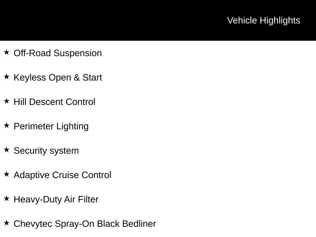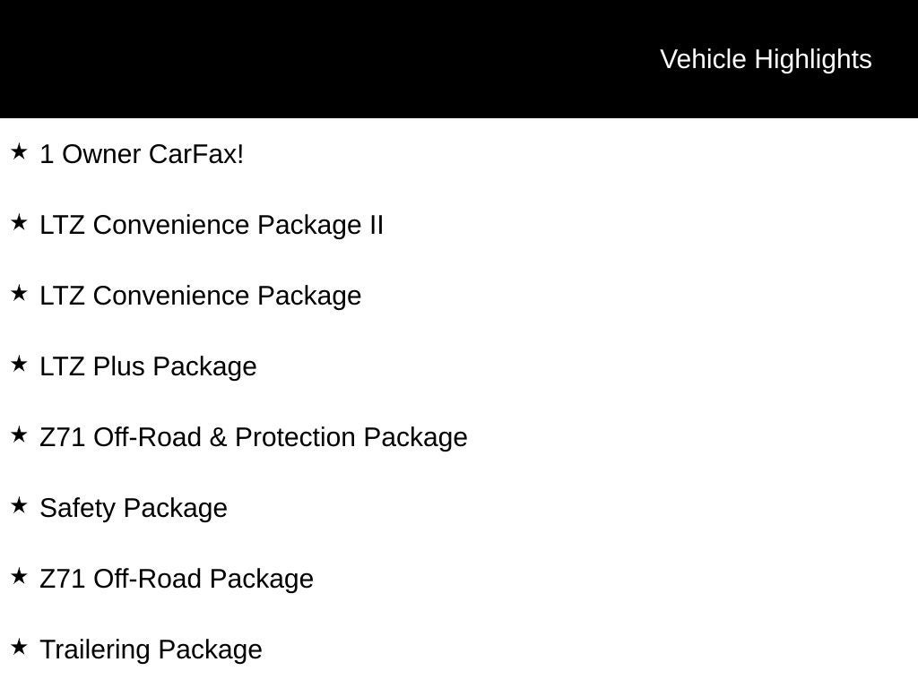 Silverado 1500 LTZ, 4D Crew Cab, EcoTec3 5.3L V8, 10-Speed Automatic, 4WD, Summit White, Jet Black Leather, 10-Way Power Driver Seat w/Lumbar, 10-Way Power Passenger Seat Adjuster w/Lumbar, 12.3 Multicolor Reconfigurable Digital Display, 2 USB Data Ports, 2nd Row Heated Outboard Seats, Adaptive Cruise Control, All-Weather Floor Liner (LPO) (AAK), Chevytec Spray-On Black Bedliner, Dual Exhaust w/Polished Outlets, Floor Mounted Center Console, HD Surround Vision, Heated Driver & Front Outboard Passenger Seats, Heavy-Duty Air Filter, Hill Descent Control, Hitch Guidance, Integrated Trailer Brake Controller, Keyless Open & Start, LTZ Convenience Package, LTZ Convenience Package II, LTZ Plus Package, Memory seat, Off-Road Suspension, Perforated Leather-Appointed Front Seat Trim, Perimeter Lighting, Power driver seat, Power Sliding Rear Window w/Rear Defogger, Power Tilt & Telescoping Steering Column, Premium Bose 7-Speaker Sound System, Rear Cross Traffic Braking, Rear Pedestrian Alert, Remote keyless entry, Remote Vehicle Starter System, Safety Alert Seat, Safety Package, Security system, Trailer Camera Provisions, Trailer Side Blind Zone Alert, Trailering Package, Ultrasonic Front & Rear Park Assist, Universal Home Remote, Ventilated Driver & Front Passenger Seats, Wheels: 20 x 9 Sterling Silver Painted Aluminum, Wireless Charging, Z71 Off-Road & Protection Package, Z71 Off-Road Package, 120-Volt Bed Mounted Power Outlet, 120-Volt Interior Power Outlet, 170 Amp Alternator, 3.23 Rear Axle Ratio, 4-Wheel Disc Brakes, 7 Speakers, ABS brakes, Air Conditioning, Alloy wheels, AM/FM radio: SiriusXM with 360L, Auto High-beam Headlights, Auto-dimming door mirrors, Auto-Dimming Inside Rear-View Mirror, Auto-dimming Rear-View mirror, Auto-Locking Rear Differential, Automatic Emergency Braking, Automatic temperature control, Bluetooth® For Phone, Brake assist, Bumpers: chrome, Chevrolet Connected Access Capable, Chrome Assist Steps, Chrome Mirror Caps, Color-Keyed Carpeting Floor Covering, Compass, Deep-Tinted Glass, Delay-off headlights, Driver door bin, Driver Memory, Driver vanity mirror, Dual front impact airbags, Dual front side impact airbags, Dual Rear USB Ports (Charge Only), Electric Rear-Window Defogger, Electrical Steering Column Lock, Electronic Cruise Control, Electronic Stability Control, Electronic Transmission Range Selector Shifter, Following Distance Indicator, Forward Collision Alert, Front anti-roll bar, Front Bucket Seats, Front Center Armrest, Front dual zone A/C, Front fog lights, Front Frame-Mounted Black Recovery Hooks, Front LED Fog Lamps, Front License Plate Kit, Front Pedestrian Braking, Front Rain-Sensing Wipers, Front reading lights, Front Rubberized Vinyl Floor Mats, Front wheel independent suspension, Fully automatic headlights, Heated door mirrors, Heated front seats, Heated Steering Wheel, Heated steering wheel, High Capacity Suspension Package, Hitch Guidance w/Hitch View, Illuminated entry, In-Vehicle Trailering System App, IntelliBeam Automatic High Beam On/Off, Lane Keep Assist w/Lane Departure Warning, LED Cargo Area Lighting, Low tire pressure warning, Occupant sensing airbag, OnStar & Chevrolet Connected Services Capable, Outside Heated Power-Adjustable Mirrors, Outside temperature display, Overhead airbag, Overhead console, Panic alarm, Passenger door bin, Passenger vanity mirror, Power door mirrors, Power Front Passenger Windows w/Express Up/Down, Power Front Windows w/Driver Express Up/Down, Power passenger seat, Power Rear Windows w/Express Down, Power steering, Power Tailgate, Power windows, Preferred Equipment Group 1LZ, Premium audio system: Chevrolet Infotainment 3 Premium, Radio data system, Radio: Chevrolet Infotainment 3 Premium System, Rain sensing wipers, Rear reading lights, Rear Rubberized-Vinyl Floor Mats, Rear seat center armrest, Rear step bumper, Rear Wheelhouse Liners, Rear window defroster, SiriusXM w