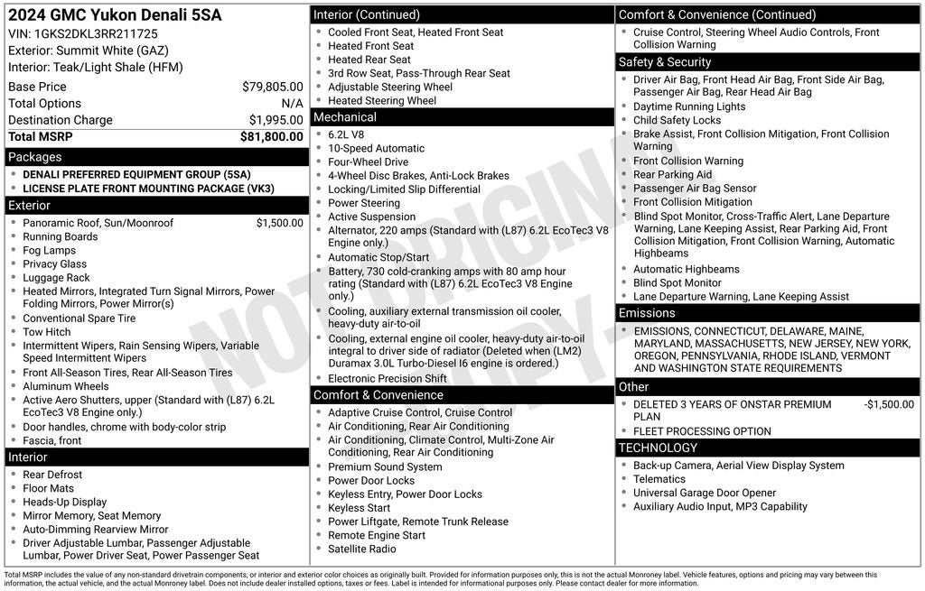 Priced below KBB Fair Purchase Price! Summit White 2024 GMC Yukon 4D Sport Utility Denali 4WD 10-Speed Automatic with Overdrive EcoTec3 6.2L V8Adaptive Cruise Control, Adaptive suspension, Alloy wheels, Bose 14-Speaker Surround w/CenterPoint, Dual-Pane Panoramic Power Sunroof, Front & Rear Park Assist, Heated Driver & Front Passenger Seats, Heated rear seats, Heated Steering Wheel, Navigation System, Perforated Heated & Ventilated Dr & Frt Pass Seats, Power Liftgate, Security system, Steering wheel mounted audio controls, Wireless Charging.This Yukon is well equipped with License Plate Front Mounting Package, Preferred Equipment Group 5SA (Adaptive Cruise Control, Bose 14-Speaker Surround w/CenterPoint, Heated Driver & Front Passenger Seats, Heated Steering Wheel, Perforated Heated & Ventilated Dr & Frt Pass Seats, Wireless Charging, 12-Way Power Seat Adjusters, 15 Diagonal Multi-Color Head-Up Display, 2 Presets For Outside Rearview Mirrors, 3rd Row 60/40 Power-Folding Split-Bench Seat, Bright Front & Rear Door Sill Plates, Chrome Door Handles w/Body-Color Strip, Dual Exhaust System, Enhanced Automatic Emergency Braking, Floor Console, Galvano Bodyside Moldings, Hands-Free Power Programmable Rear Liftgate, HD Surround Vision, Heated 2nd Row Outboard Position Seats, Hill Descent Control, Inside Rear-View Auto-Dimming Mirror, Outside Heated Power-Adjustable Mirrors, Power Release 2nd Row Bucket Seats, Power Tilt & Telescopic Steering Column, Rear Pedestrian Alert, Safety Alert Seat, and Universal Home Remote), Adaptive suspension, Alloy wheels, Dual-Pane Panoramic Power Sunroof, Front & Rear Park Assist, Heated rear seats, Navigation System, Power Liftgate, Security system, Steering wheel mounted audio controls, 14 Speakers, 3.23 Rear Axle Ratio, 3rd row seats: split-bench, 4-Wheel Disc Brakes, ABS brakes, Air Conditioning, AM/FM radio: SiriusXM with 360L, AM/FM Stereo, Apple CarPlay/Android Auto, Auto High-beam Headlights, Auto-dimming door mirrors, Auto-dimming Rear-View mirror, Auto-leveling suspension, Automatic Emergency Braking, Automatic temperature control, Bodyside moldings, Brake assist, Bumpers: body-color, Compass, Delay-off headlights, Deleted 3 Years of OnStar Premium Plan, Driver door bin, Driver vanity mirror, Dual front impact airbags, Dual front side impact airbags, Electronic Stability Control, Emergency communication system: OnStar and GMC connected services capable, Following Distance Indicator, Forward Collision Alert, Four wheel independent suspension, Front anti-roll bar, Front Bucket Seats, Front Center Armrest, Front dual zone A/C, Front fog lights, Front Pedestrian Braking, Front reading lights, Fully automatic headlights, Garage door transmitter, Heads-Up Display, Heated door mirrors, Heated front seats, Heated steering wheel, Illuminated entry, IntelliBeam Automatic High Beam On/Off, Lane Change Alert w/Side Blind Zone Alert, Lane Keep Assist w/Lane Departure Warning, Low tire pressure warning, Magnetic Ride Control Suspension, Memory seat, Occupant sensing airbag, Outside temperature display, Overhead airbag, Overhead console, Panic alarm, Passenger door bin, Passenger vanity mirror, Perforated Leather Seating Surfaces, Power door mirrors, Power driver seat, Power passenger seat, Power steering, Power windows, Rain sensing wipers, Rear air conditioning, Rear anti-roll bar, Rear Cross Traffic Alert, Rear reading lights, Rear window defroster, Rear window wiper, Remote keyless entry, Roof rack: rails only, SiriusXM w/360L, Speed control, Speed-sensing steering, Split folding rear seat, Spoiler, Steering wheel memory, Tachometer, Telescoping steering wheel, Tilt steering wheel, Traction control, Trip computer, Turn signal indicator mirrors, Variably intermittent wipers, Ventilated front seats, Voltmeter, and Wheels: 20 x 9 6-Spoke Polished Aluminum.