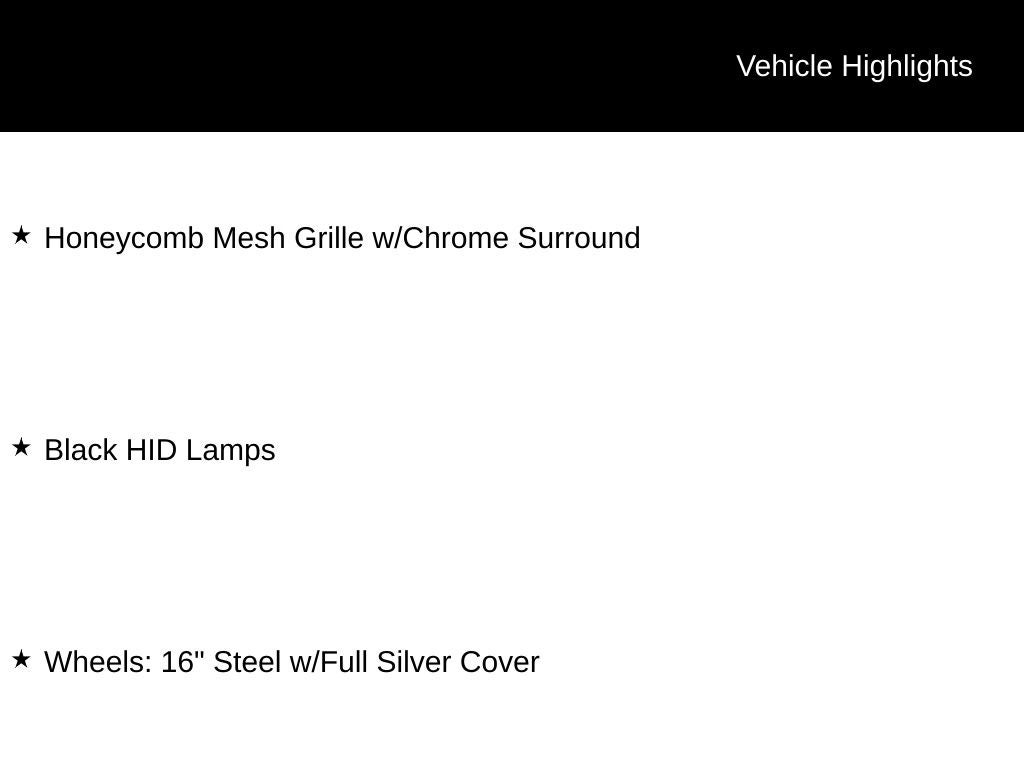 - Includes Wiper Activated Headlamps, Honeycomb Mesh Grille w/Chrome Surround, Wheels: 16 Steel w/Full Silver Cover, Black HID Lamps